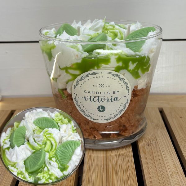 This charming candle starts with a layer of Graham Cracker Crust crumbs, followed by a second layer of our delectable Cream Cheese Frosting scent. The final touch is a whipped topping in Key Lime Pie with a hint of Granny's Pie Crust, finished with a wax dollop embed, limes, and a sprinkle of glitter. Absolutely adorable!