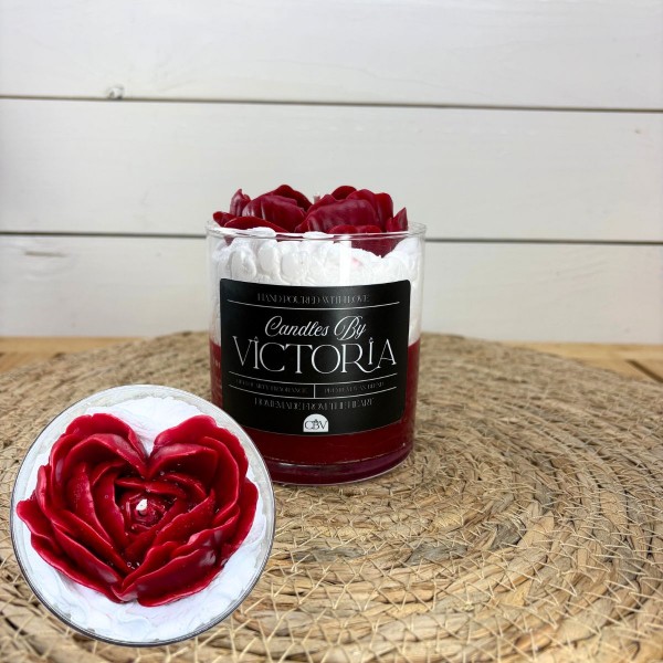 Introducing our new 2026 Valentines Day Collection! Fill your home with the heartwarming notes of Red Velvet Cake! This candle includes one layer of red wax, a whipped layer of white wax, and a beautiful heart rose embed. This is a 12oz mini cylinder cutie, these are NEW and make the perfect simple gifts. The aroma boasts sweet, creamy, and buttery vanilla top notes, with hints of spicy nutmeg, ginger, and cinnamon, all resting on a subtly nutty cake base.