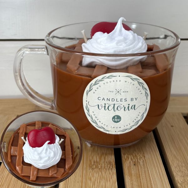 This candle features our delightful Dutch Apple Crunch scent, which is incredibly enticing! It starts with a base layer of brown wax in the Dutch Apple Crunch fragrance, topped with a crumbly wax layer in the same aroma. Next, we add a scoop of ice cream-shaped wax and apple-shaped wax embeds, finishing with a caramel drizzle. And for that extra charm, we adorn the candle's edge with gold/brown glitter. It's adorably cute and smells fantastic!
