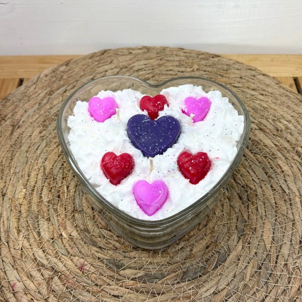 Introducing our new 2026 Valentines Day Collection! Discover the exquisite triple-wick heart dish candle, an ideal present for your loved one! This beauty is fragranced in the wonderful scent of "Clouds (type)" and begins with a layer of white wax, follwed by another layer of white whipped wax, topped with assorted pink and purple heart embeds. The fragrances Clouds (type) opens with the freshness of zesty citrus and sweet pineapple, seamlessly merging with the lushness of creamy coconut, enriched by the warmth of vanilla and cashmere, and finally settling into a woody base.