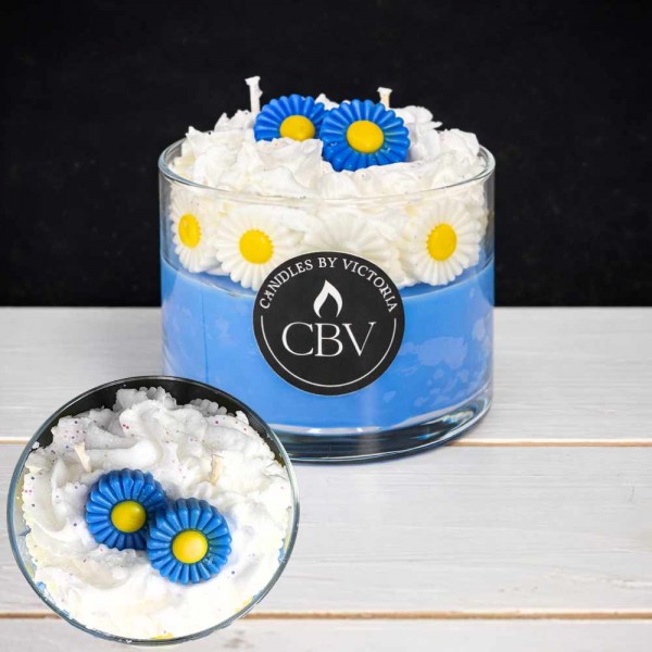 This delightful candle starts with a blue layer scented with our Daisy (type) fragrance. The interior is adorned with white and yellow daisy wax embeds, followed by a layer of white whipped wax with the same aroma, and topped with blue and yellow daisies.